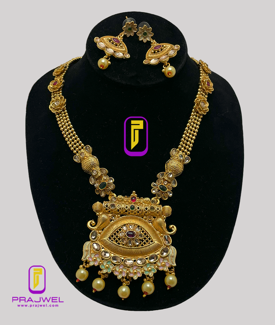 Give your look a classical touch with this antique necklace set from Prajwel . This gorgeous Red and green beauty has Mazak/Alloy in the base and fine colour stonework and colour meena, making it look precious. This necklace set goes well with any ethnic outfit you like and adds a sumptuous touch to your look effortlessly!