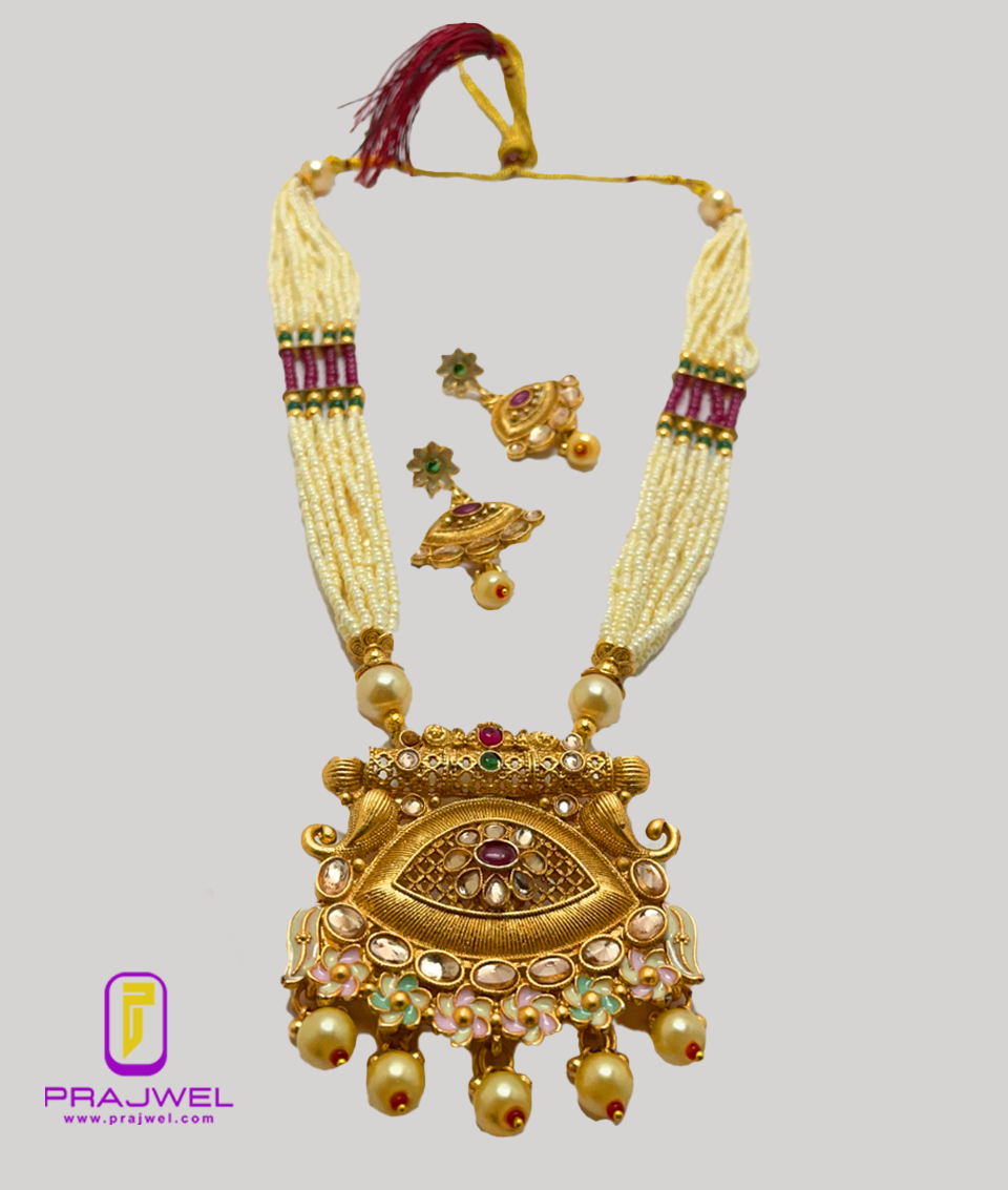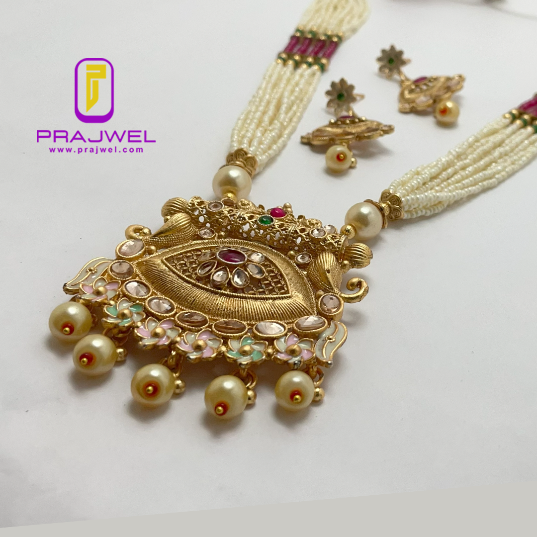 Enhance your look with a classic touch by wearing this antique necklace set from Prajwel. This stunning piece features a beautiful combination of red and green hues, crafted from Mazak/Alloy with intricate color stonework and vibrant meenakari designs, giving it a precious appearance. This necklace set pairs perfectly with any ethnic outfit, effortlessly adding a luxurious touch to your ensemble!
