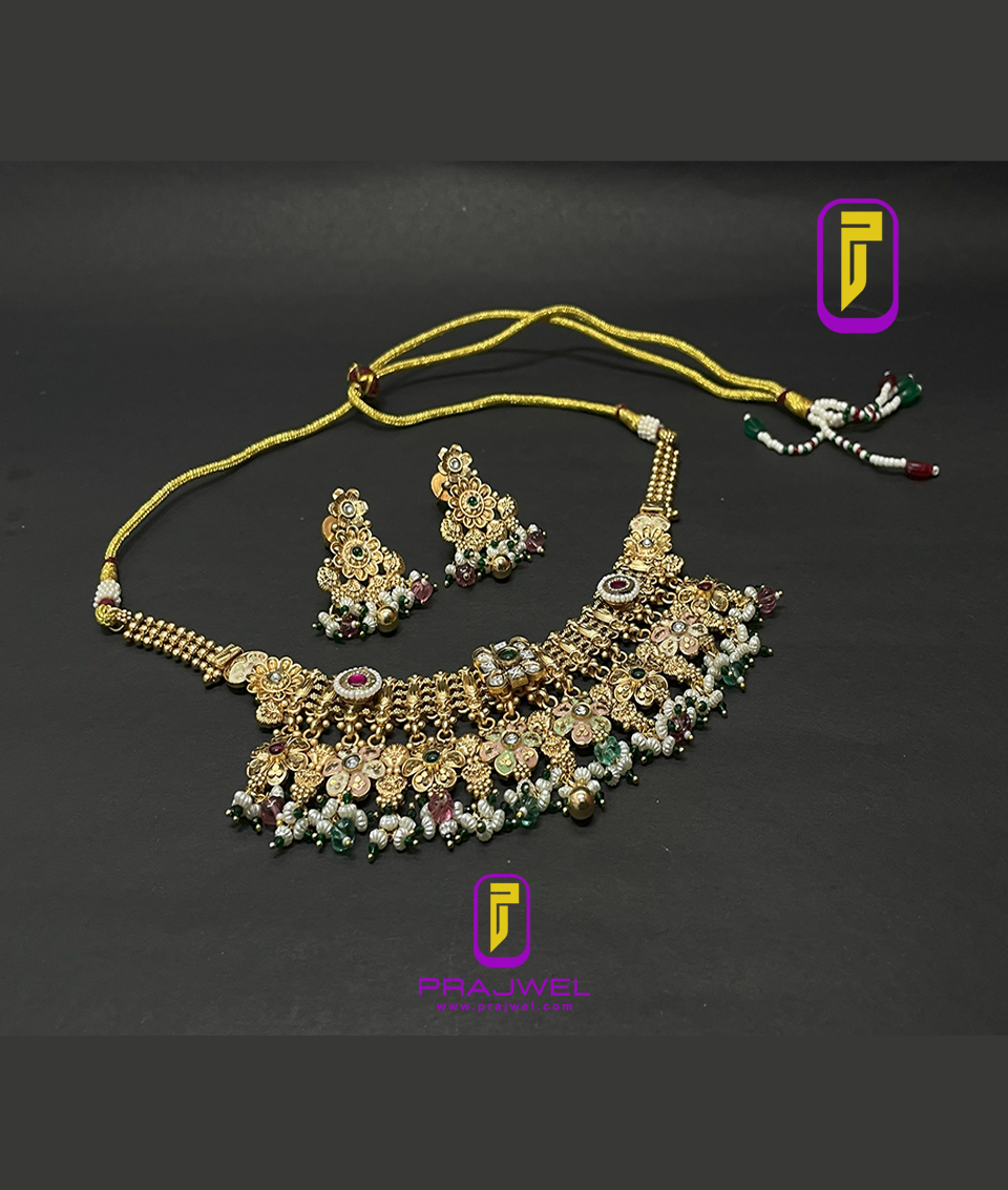 Materials & Embellishments: Gold‑plated brass metal choker set, embedded with Kundan stones, colored beads, and AD (American Diamond) stones for extra sparkle.