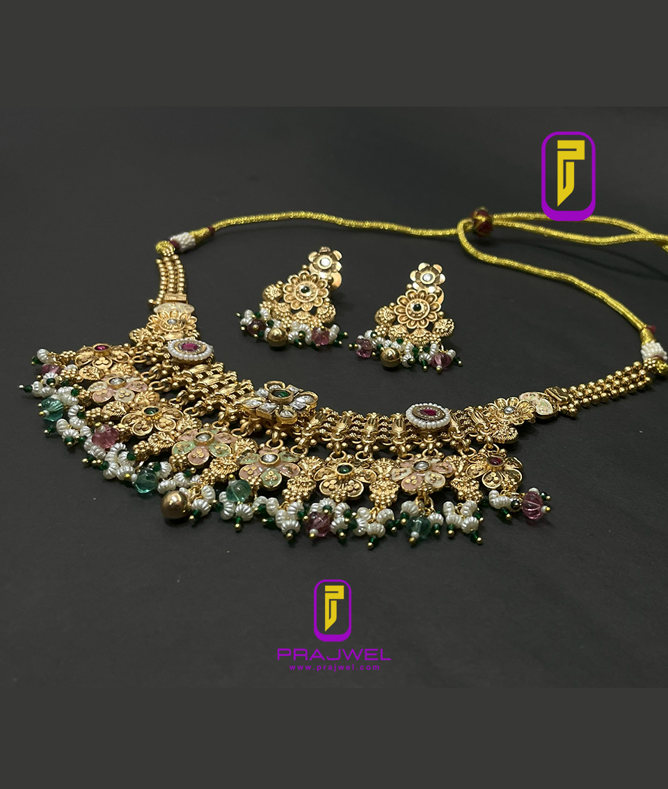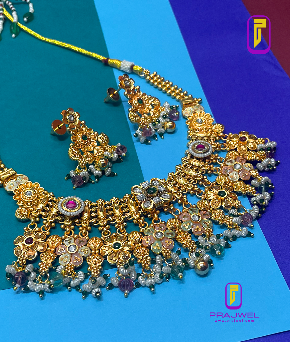 This handcrafted jewelry set draws inspiration from temple architecture and floral motifs, bringing a timeless and regal aura to your neckline: