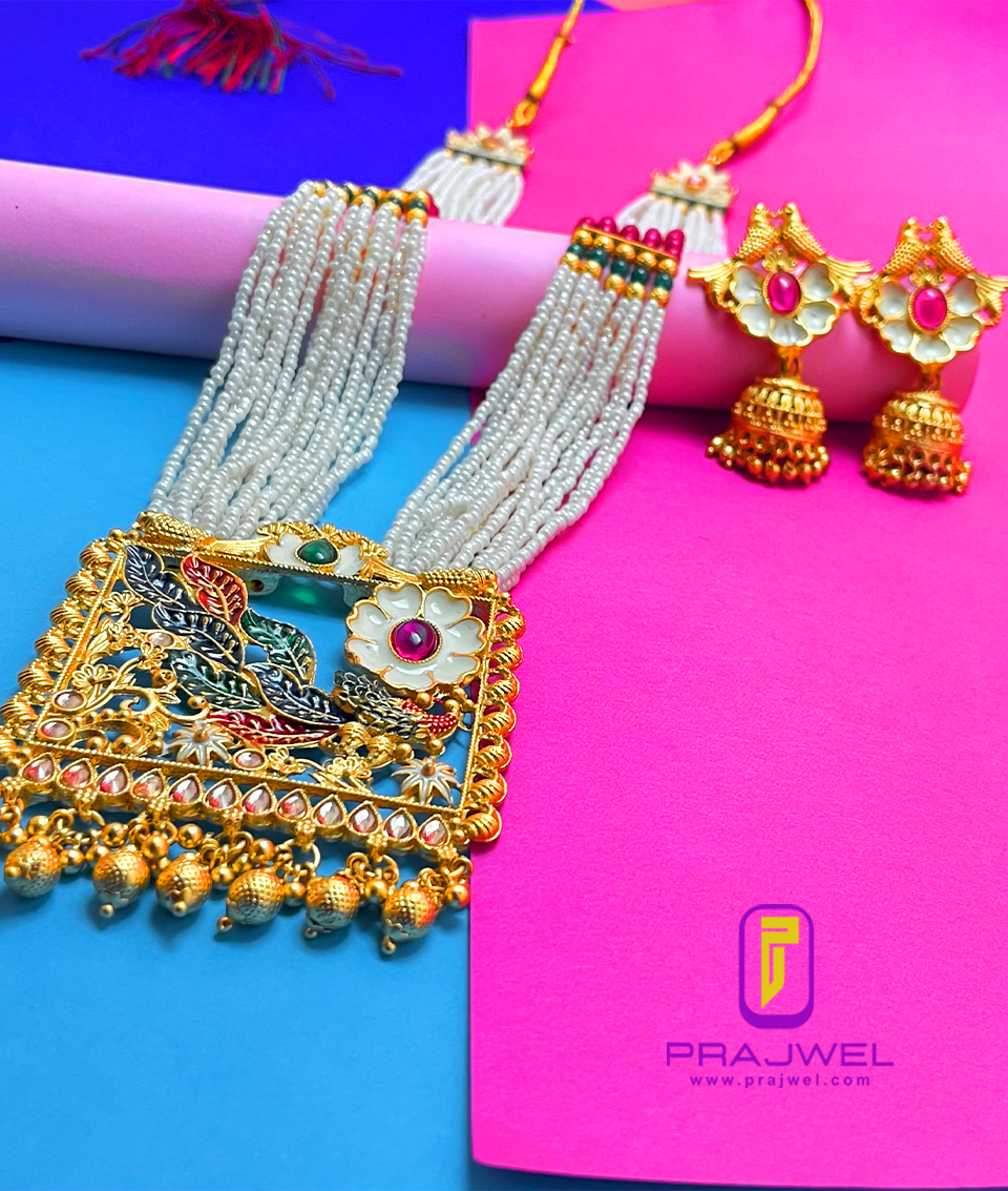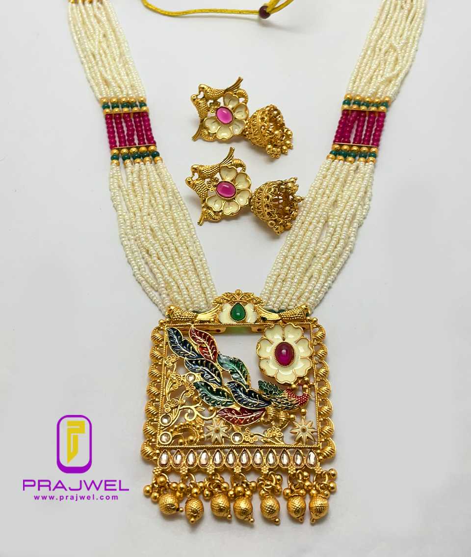 Enhance your look with a classic touch by wearing this antique necklace set from Prajwel. This stunning piece features a beautiful combination of red and green hues, crafted from Mazak/Alloy with intricate color stonework and vibrant meenakari designs, giving it a precious appearance. This necklace set pairs perfectly with any ethnic outfit, effortlessly adding a luxurious touch to your ensemble!