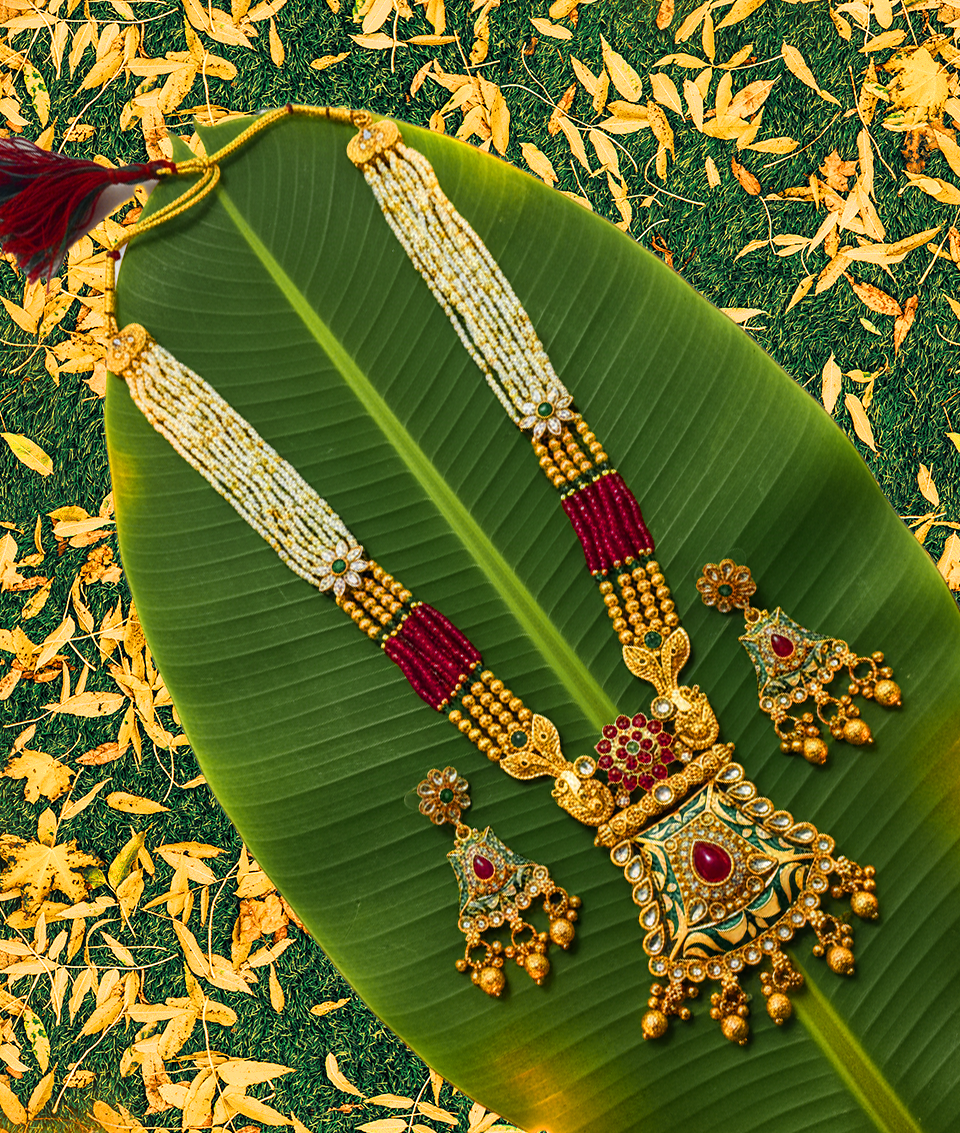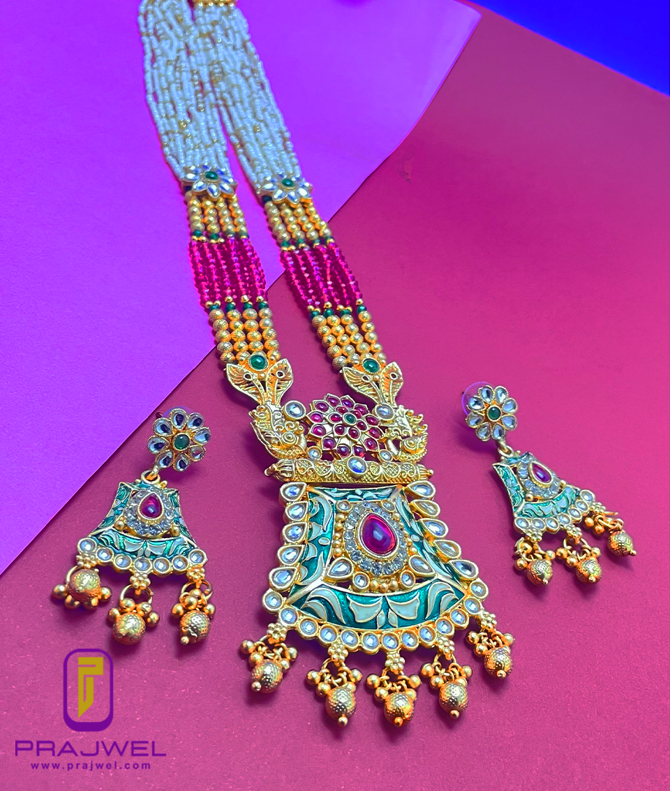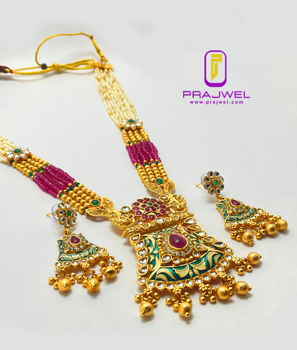 Enhance your look with a classic touch by wearing this antique necklace set from Prajwel. This stunning piece features a beautiful combination of red and green hues, crafted from Mazak/Alloy with intricate color stonework and vibrant meenakari designs, giving it a precious appearance. This necklace set pairs perfectly with any ethnic outfit, effortlessly adding a luxurious touch to your ensemble!