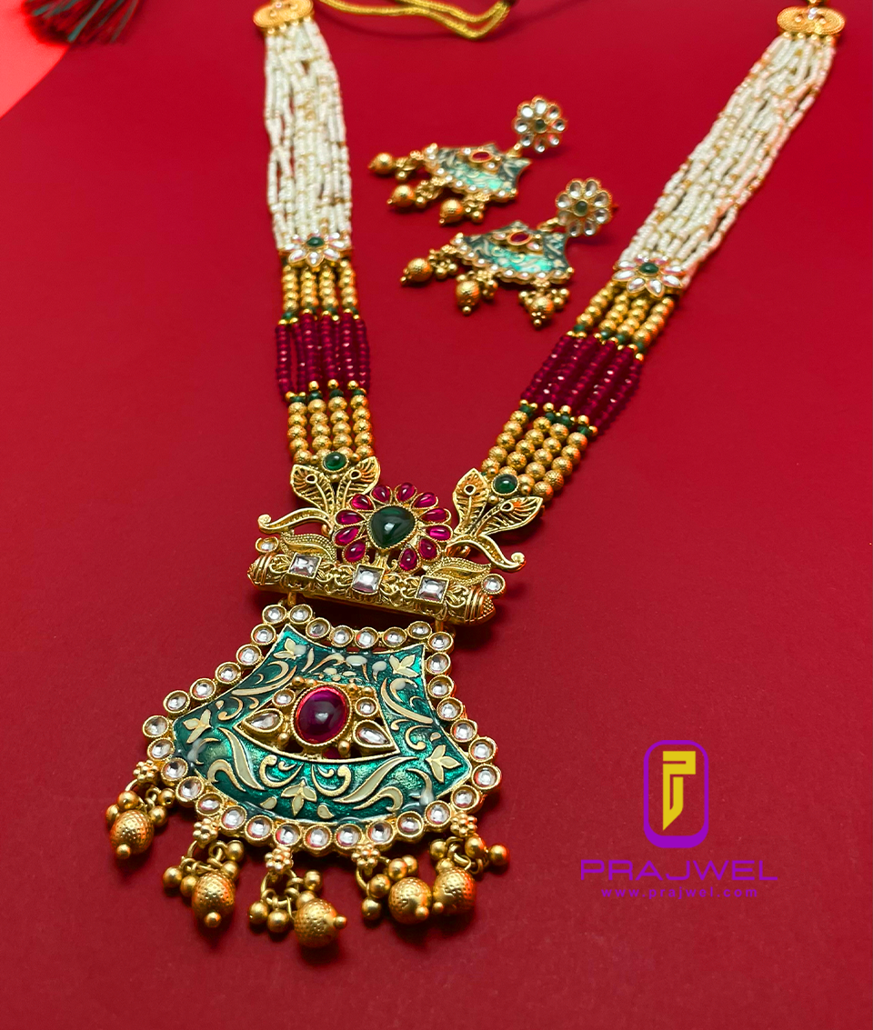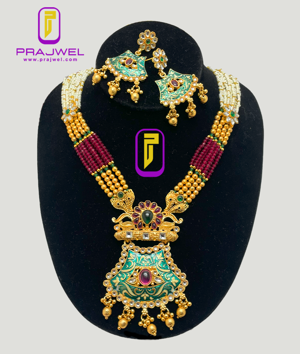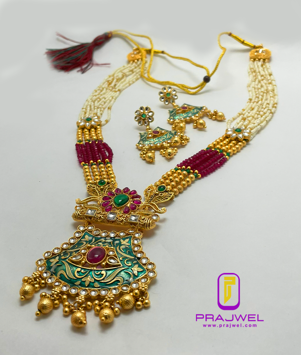 Enhance your look with a classic touch by wearing this antique necklace set from Prajwel. This stunning piece features a beautiful combination of red and green hues, crafted from Mazak/Alloy with intricate color stonework and vibrant meenakari designs, giving it a precious appearance. This necklace set pairs perfectly with any ethnic outfit, effortlessly adding a luxurious touch to your ensemble!