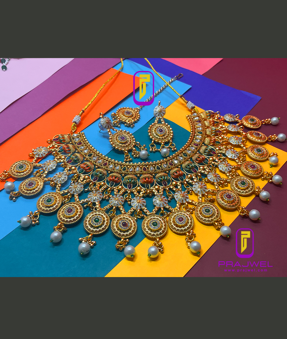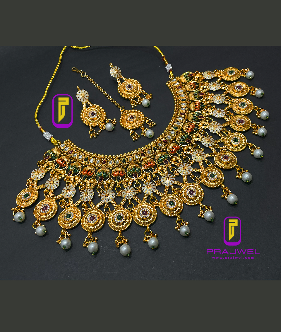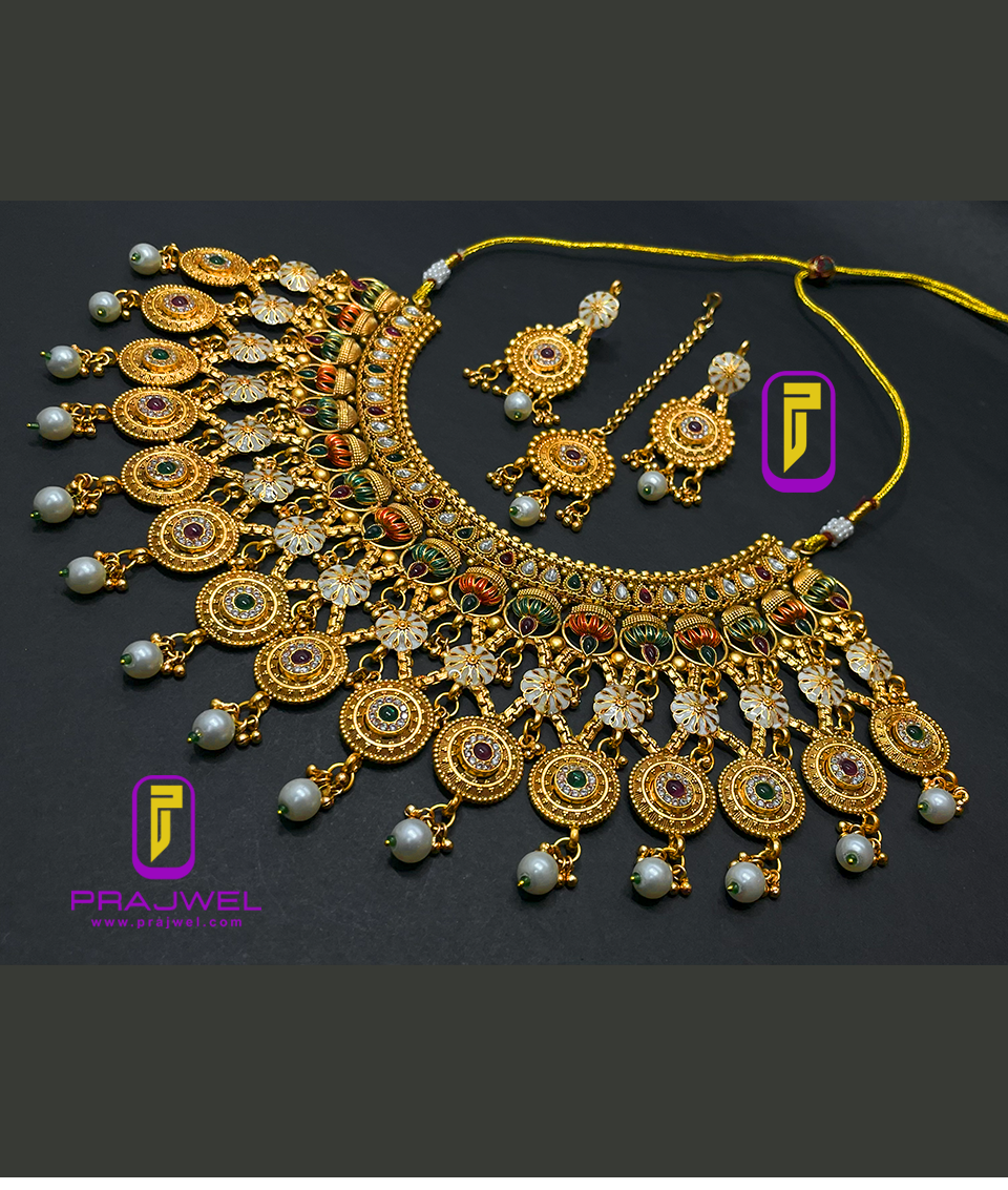 Necklace Set : Short Necklace with Adjustable Dori, Matching Earring & Maang Tikkas.