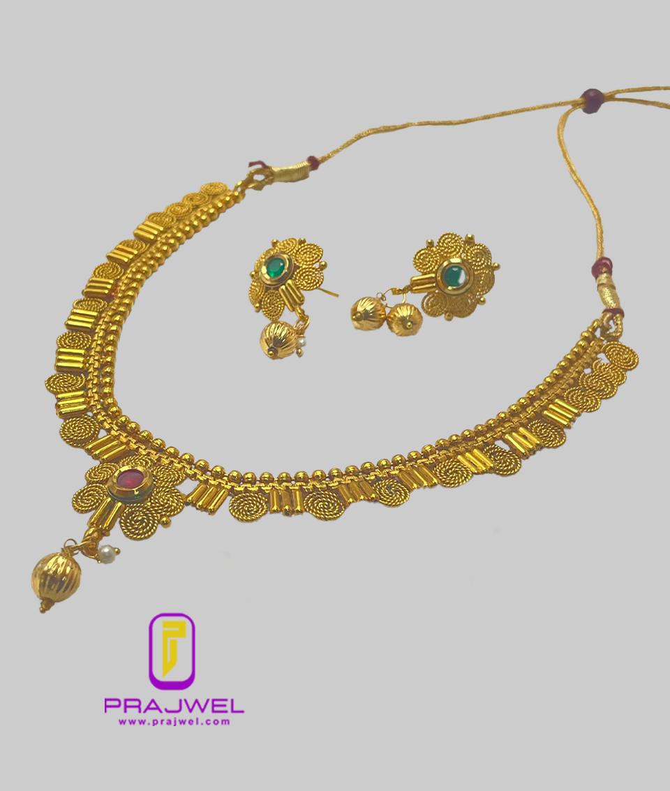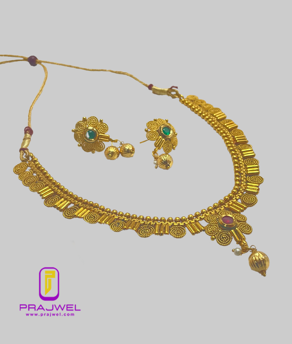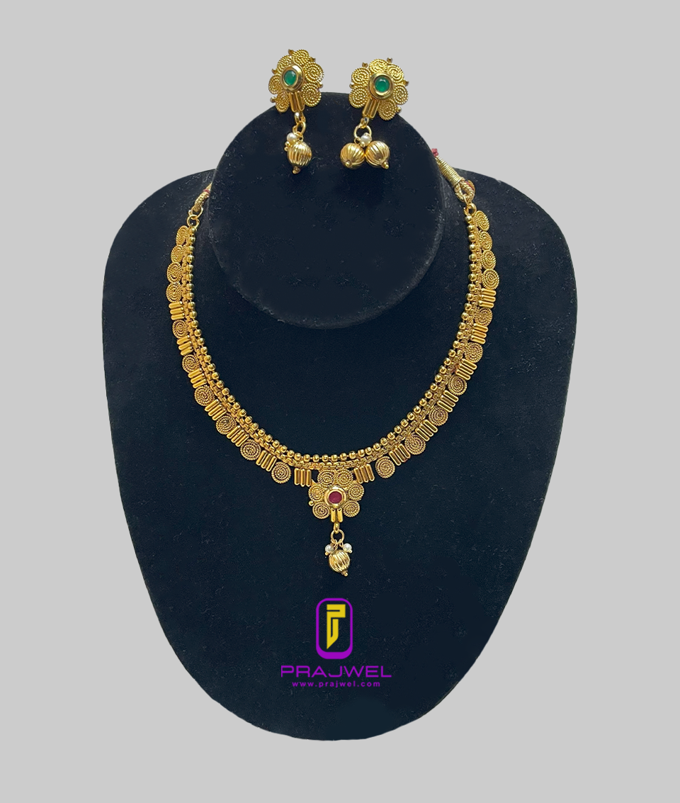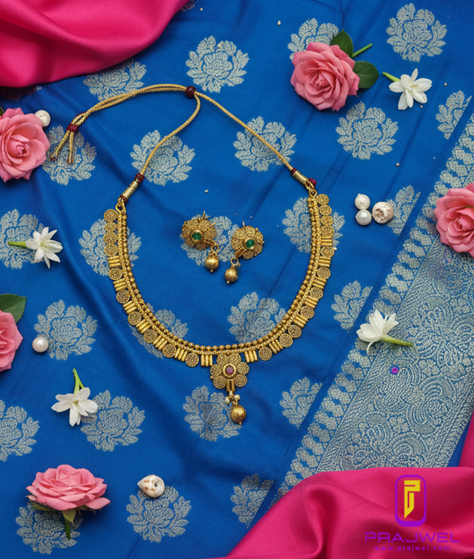 Elevate your ethnic elegance with this exquisitely crafted Antique Temple Gold Plated Necklace Set from Prajwel. Designed in a traditional South Indian style, this statement piece features intricate details inspired by temple architecture, embodying timeless heritage and expert craftsmanship.